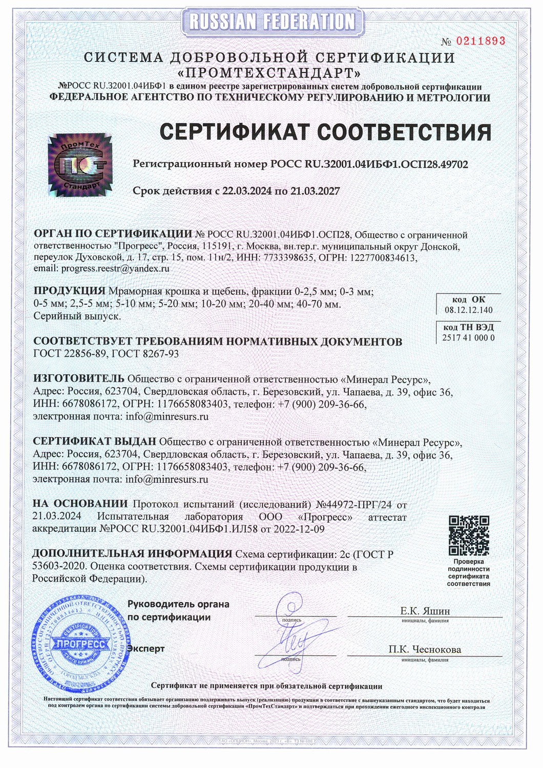 - Контроль качества: На каждый вид щебня предоставляются паспорта и сертификат.